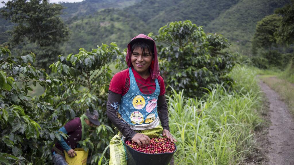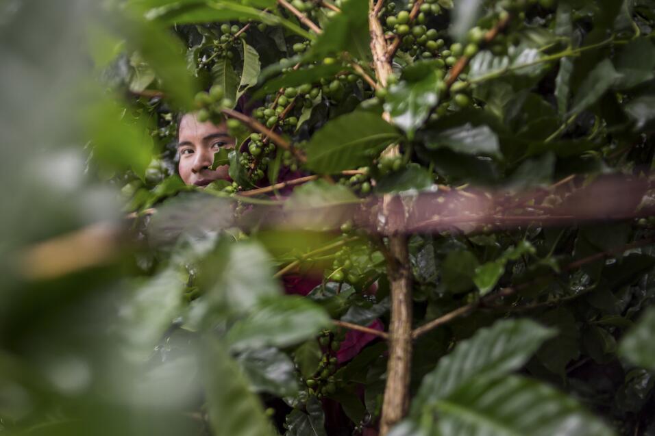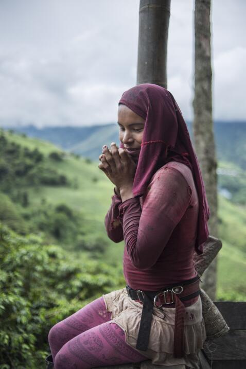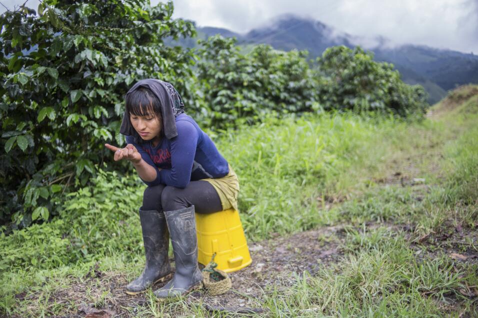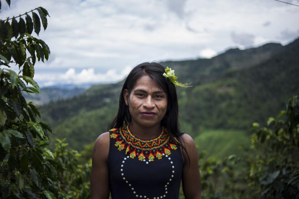 Mariana es una mujer transgénero indígena Embera. Trabaja junto a varias compañeras de su etnia recolectando granos de café en Santuario, Colombia. Los cuerpos menudos pero fuertes de las indígenas Embera son apreciados para la faena de recolección en las haciendas cafetaleras. Foto: Víctor Galeano | Univision
