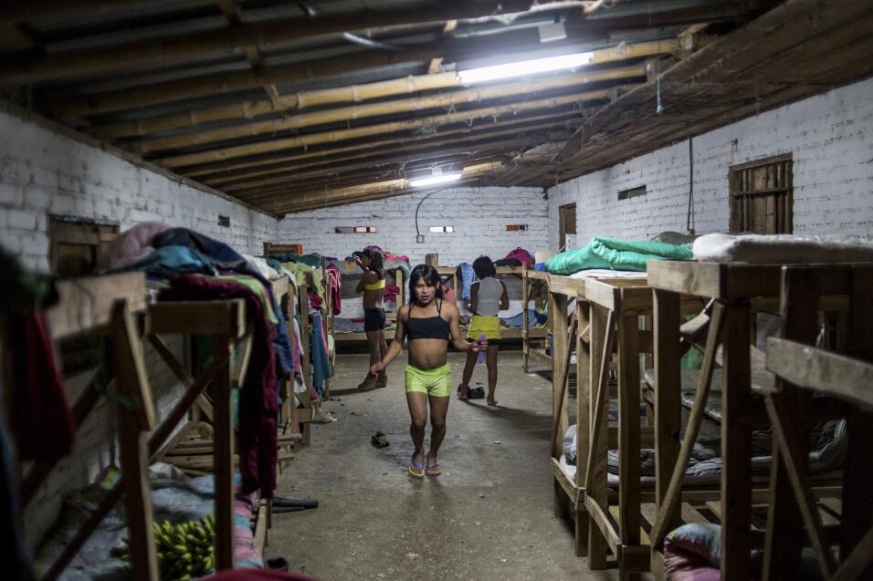 Al finalizar cada día en época de cosecha, las mujeres transgénero Embera pasan las noches en los ‘cuarteles’. Estas son habitaciones llenas de literas improvisadas con madera y colchonetas sucias que comparten los trabajadores de las haciendas cafetaleras. Foto: Víctor Galeano | Univision