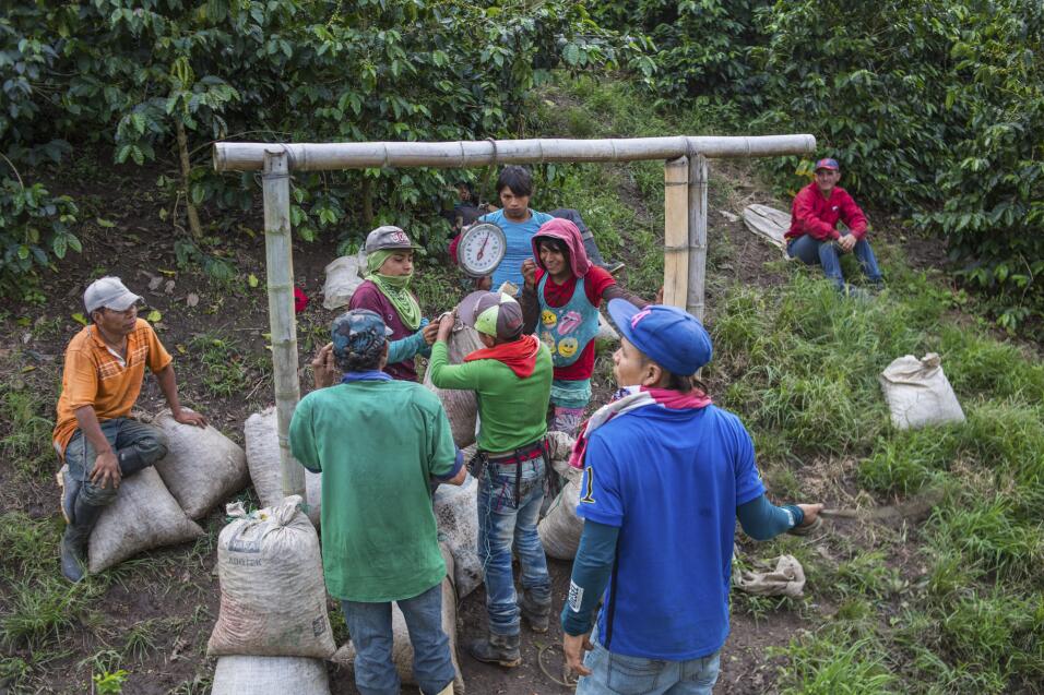 Las Embera y otros recolectores pesan la cosecha de granos al finalizar cada jornada, la rutina en las haciendas cafetaleras para saber la paga que corresponde a cada uno. En otras épocas del año, ese trabajo es pagado por la cantidad de horas. Foto: Victor Galeano | Univision
